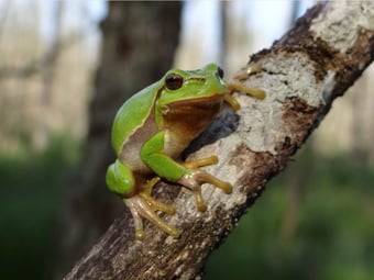 Obwohl der Laubfrosch im Frühjahr mit seinen markanten nächtlichen Paarungsrufen zu den auffälligsten Bewohnern des Rainer Waldes zählt, gehört viel Glück dazu, ihn zu Gesicht zu bekommen. Beim Sonnenbaden auf den Blättern von Brombeeren, Schilf oder Laubbäumen schützt ihn seine perfekte Tarnung davor, entdeckt zu werden. Mit etwas Glück ist es aber durchaus möglich.